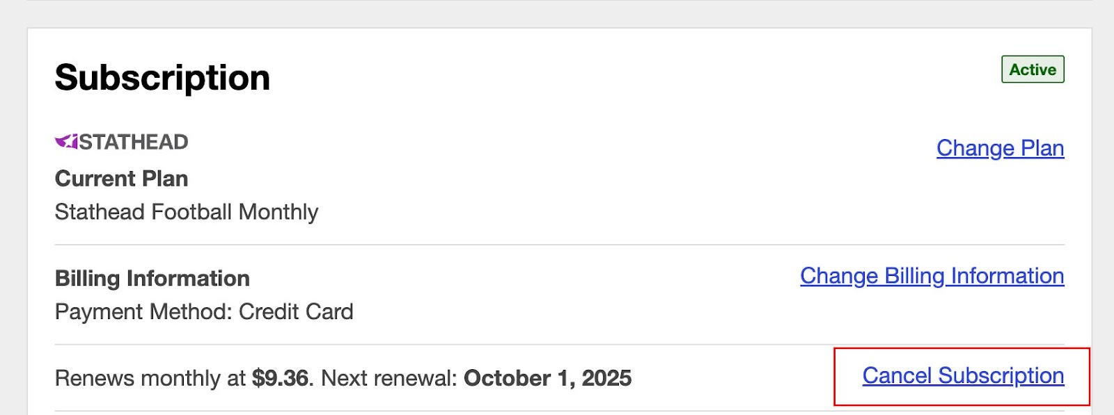 Click on “Cancel Subscription” next to the Stathead subscription you would like to stop