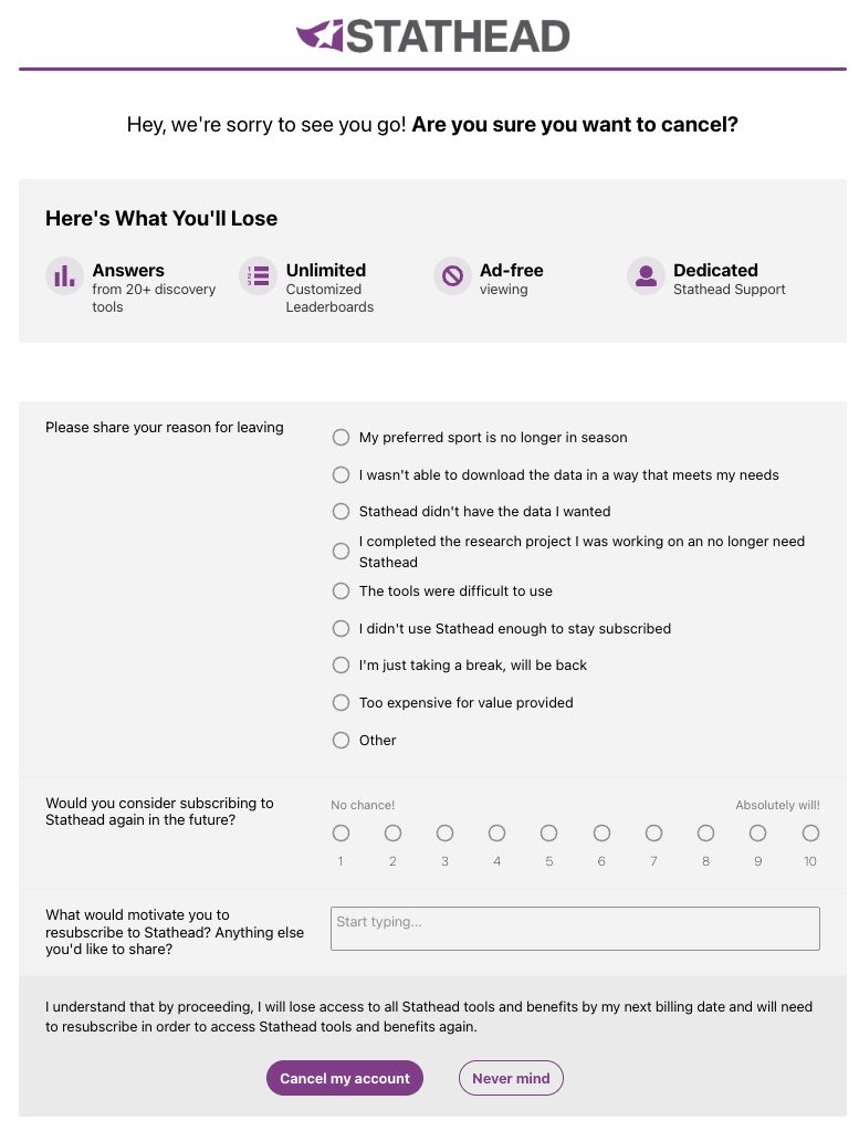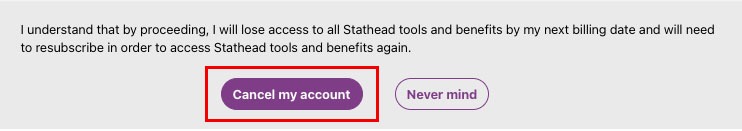 You will still be able to use and access your Stathead account until your scheduled renewal date, but will not be automatically billed when it expires.