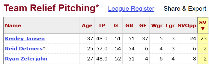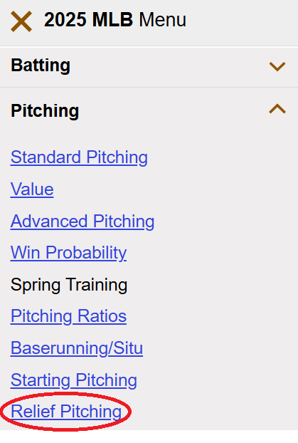 This page has a summary of each team’s reliever data, as well as a table with the individual stats for every reliever in the league. Here is that page for the 2025 season: