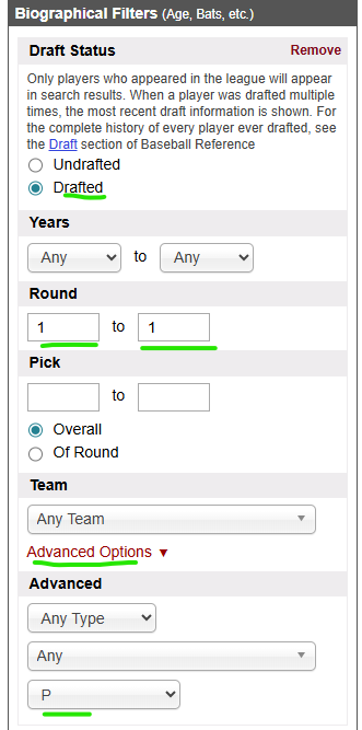 You can use the Player Season Finder to do draft-related searches on players. In the Biographical Filters section, there is a filter "Draft Status". When you choose Drafted, a menu of more options is revealed, where you can search on various criteria: draft year(s), round, pick number (overall and in round), draft team, college and position. NOTE: Only players who appeared in the league will appear in these draft-related search results. When a player was drafted multiple times, the most recent draft information is shown. For example, here is a search for pitchers chosen in the first round, sorted by career wins.